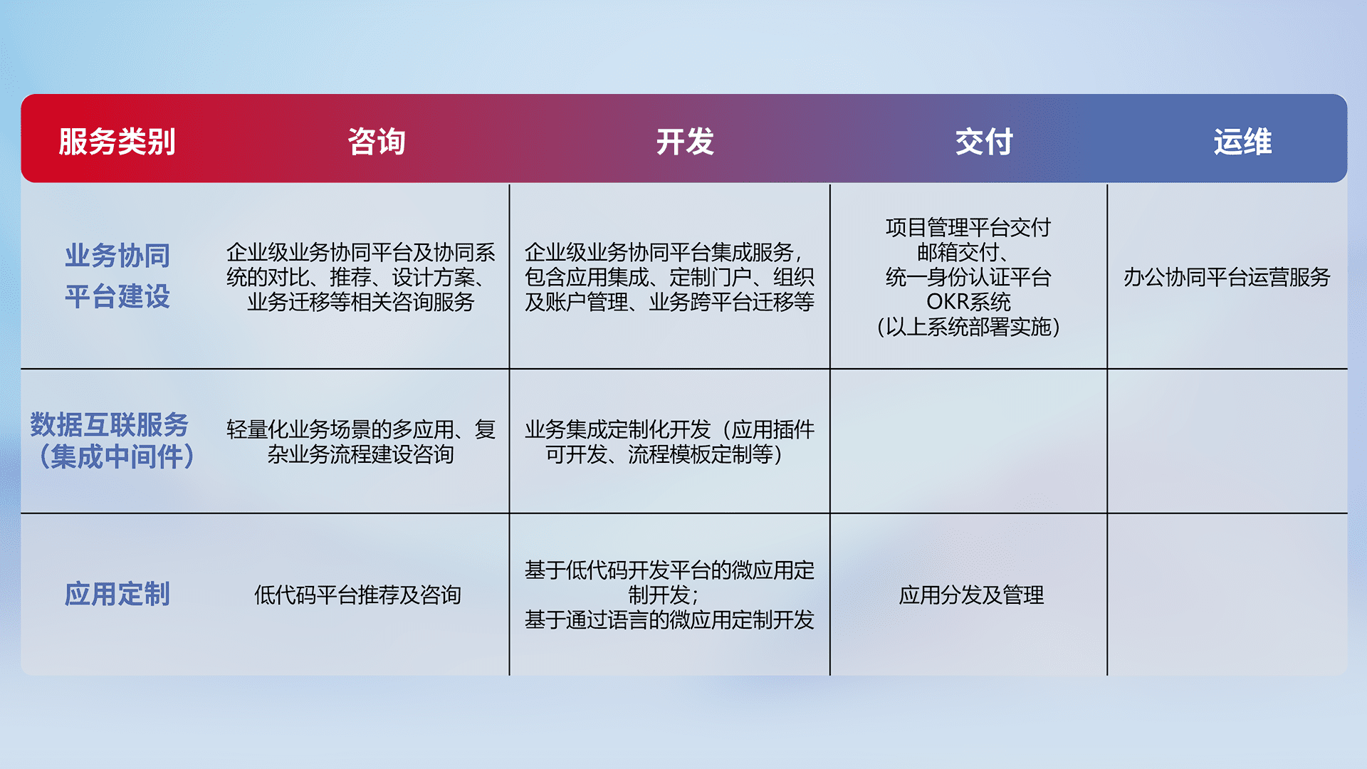 针对钉钉、、企微、、IDaas等平台级产品提供产品的规划、、方案、、交付、、、定制化开发等服务,,实现如统一协同办公、、、智能客户服务、、、、混合会议管理、、智能数据查询、、、等业务场景,,,实现数字化转型。。。
