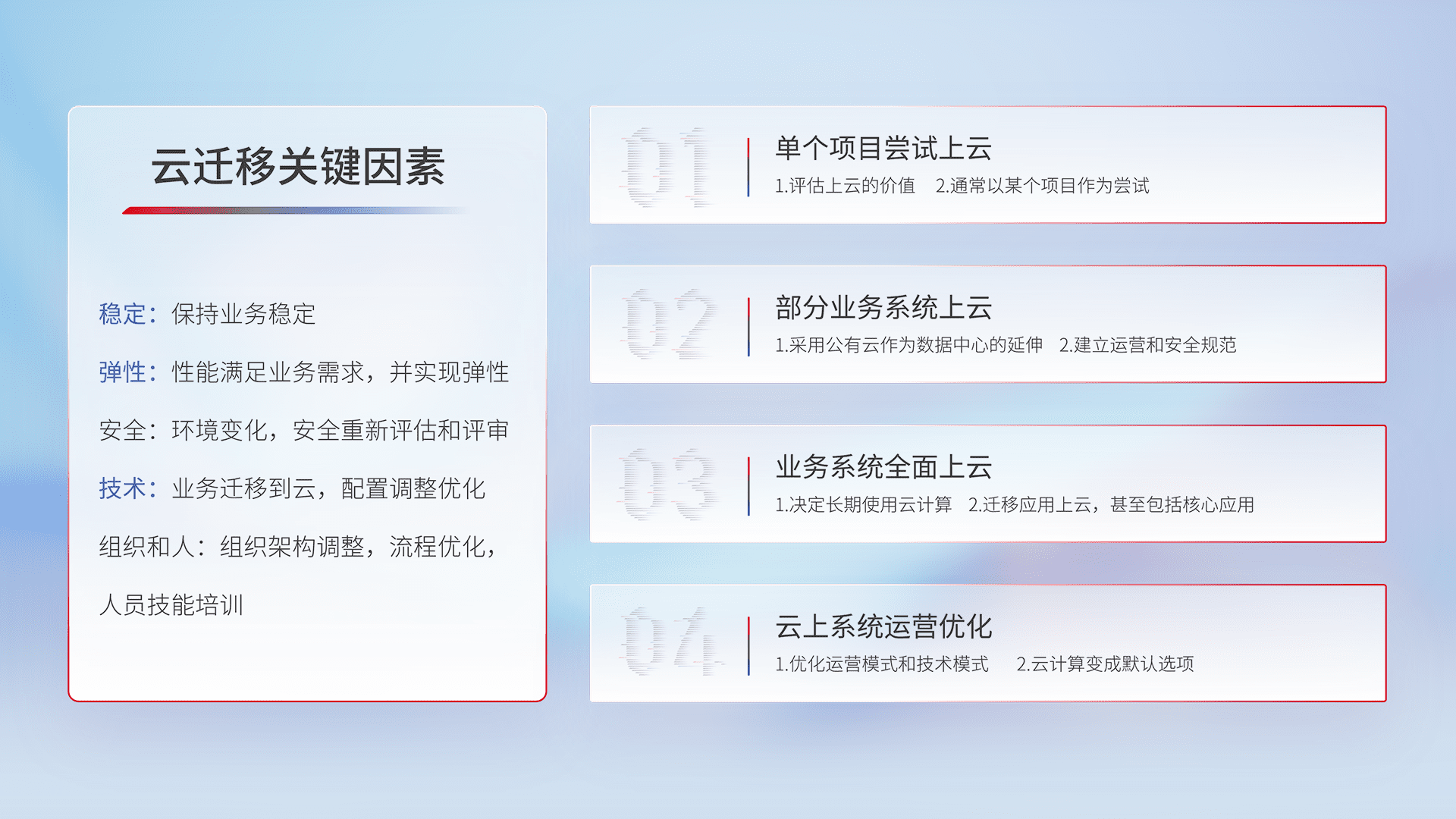 结合实际业务,,,从规划设计、、、云平台选型、、、云原生改造、、数据迁移、、集成交付,,迁移全过程为客户识别最佳上云路径,,,,做好风险识别管理,,,设计网络架构、、、身份权限、、安全审计合规、、、操作审计、、、、日志审计、、、、监控告警策略、、、、多站点容灾设计等,,,对云上基础设施进行整体规划,,,,提升IT治理水平,,,,以满足弹性、、高可用、、高性能的需求。。。